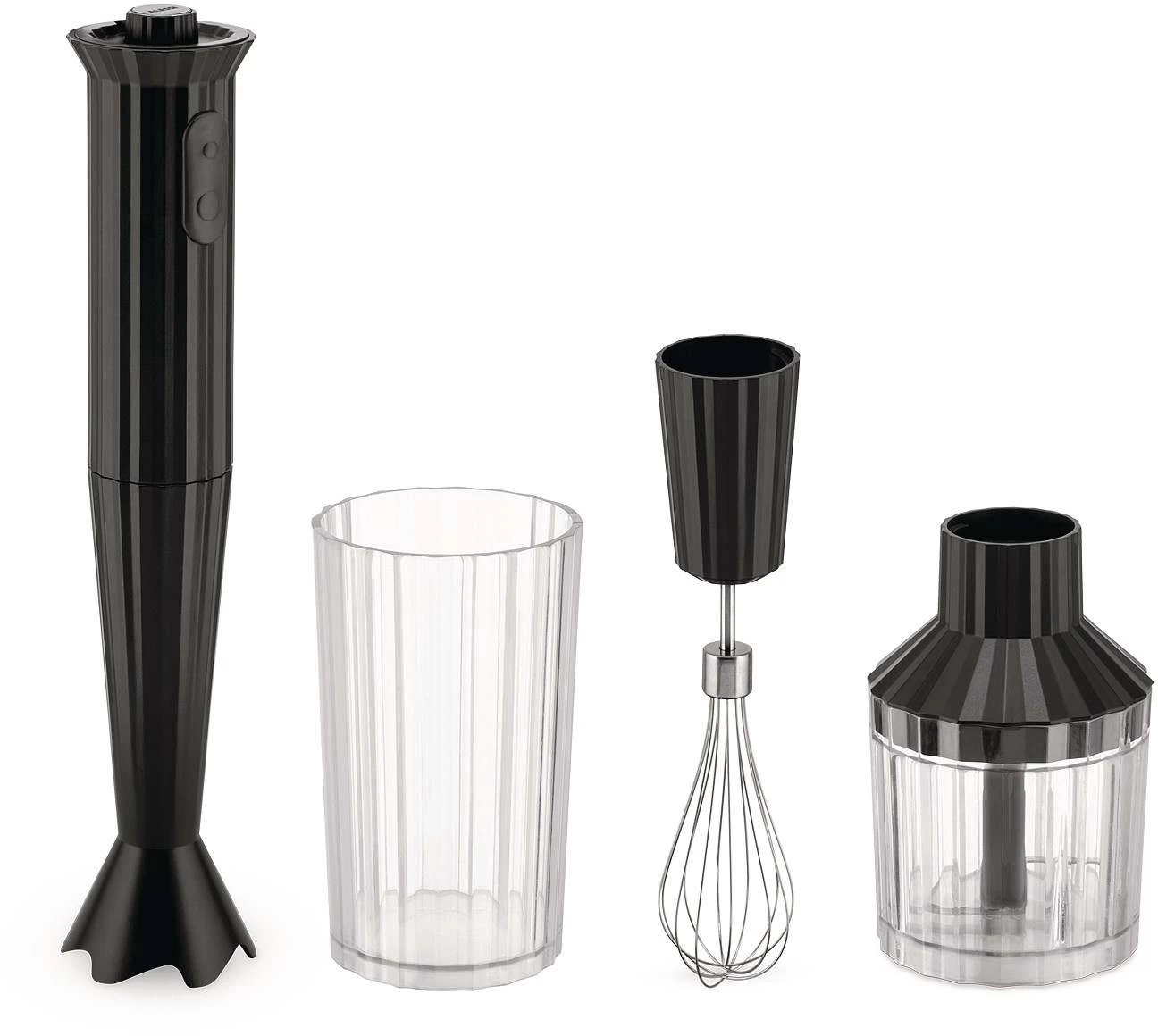 Dit staafmixer-pakket hoort bij de Alessi Plissé collectie en is ontworpen door designer Michele De Lucchi. Zijn ontwerp is gebaseerd op de geplooide jurk uit de Franse Haute Couture mode. De structuur met plooien veranderen het apparaat in een driedimensionale vorm. Door het fascinerende ontwerp is het apparaat niet alleen handig voor gebruik, maar ook een klein onderdeel in je interieur. Deze staafmixer kan je normaal en versneld bedienen. Deze staafmixer is inclusief mengbeker, garde en unversele hakmolen. De blenderkan heeft een inhoud van 700 ml en kan worden gereinigd in de vaatwasser, net als de bijgeleverde hakmolen met een inhoud van 350 ml. Een pakket met alles erop en eraan!