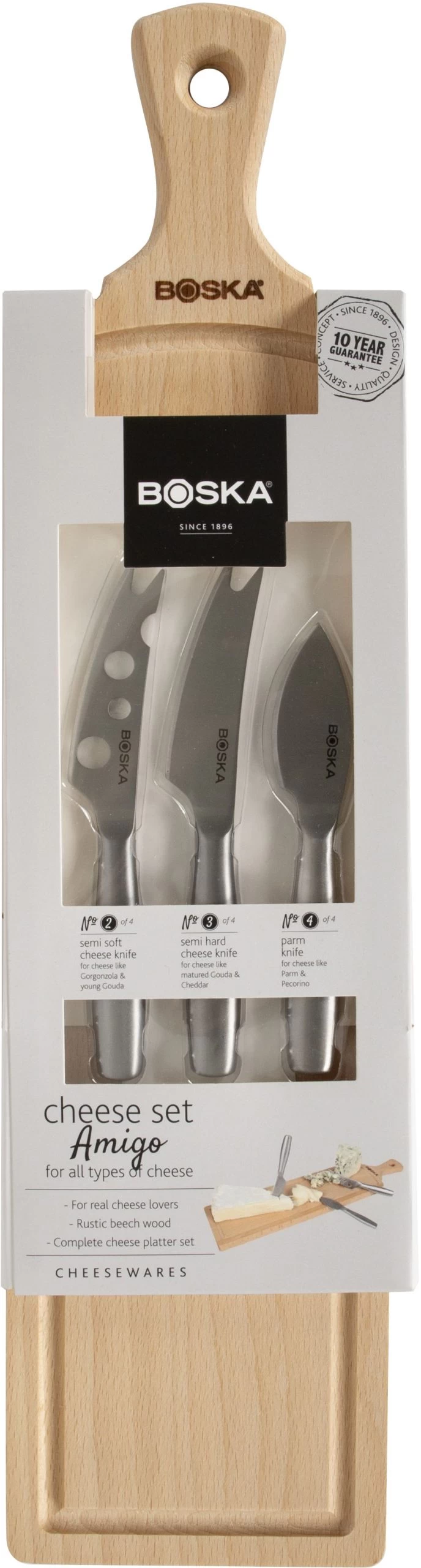 Met de Boska Kaasset Amigo serveer je het perfecte kaasplankje. Met de 3 verschillende kaasmessen en een mooie rustieke kaasplank kom je niks te kort om vrienden of familie te verrassen met de heerlijkste soorten kaas. De inbegrepen mesjes van de Copenhagen collectie zijn van hoge kwaliteit en je kan er alle soorten kaas mee snijden. De plank heeft overigens een mooi handvat waardoor je hem makkelijk serveert.