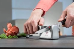 De messenslijpers van Chefs Choise beschikken over verschillende slijpfasen. Hierdoor kun je jouw messen weer de beginscherpte geven die ze nodig hebben. Naast de kleine handslijpers heeft Chefs Choise ook elektrische slijpmachines. Hiermee maak je het jezelf nog makkelijker!
