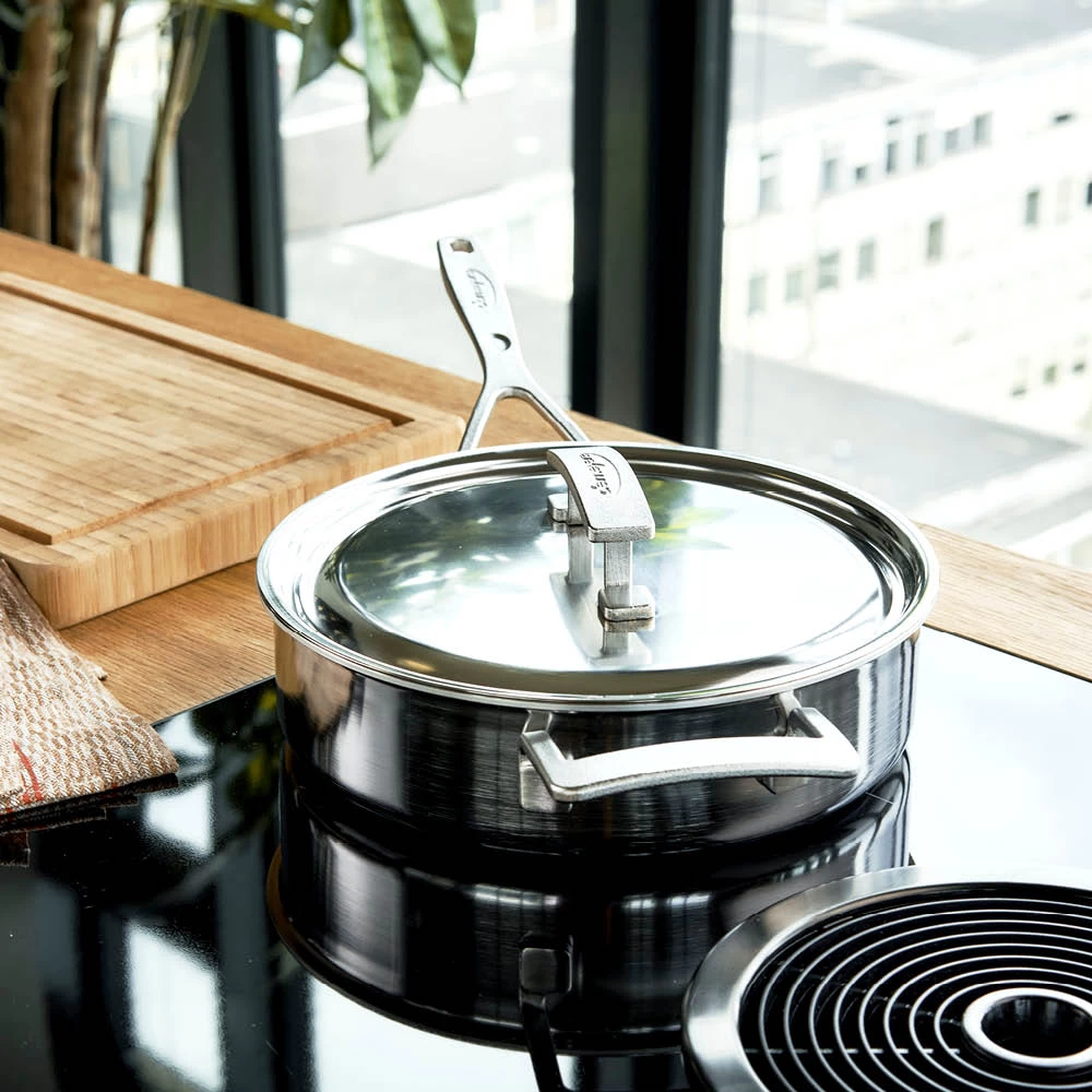 - Geschikt voor inductie: Een grote troef van het meerlagenmateriaal is dat het toelaat om zuinig te koken op inductie. Wanneer de pan de warmte heeft opgenomen, kan de stand van je inductieplaat worden teruggeschakeld, zonder het kookproces te verstoren.