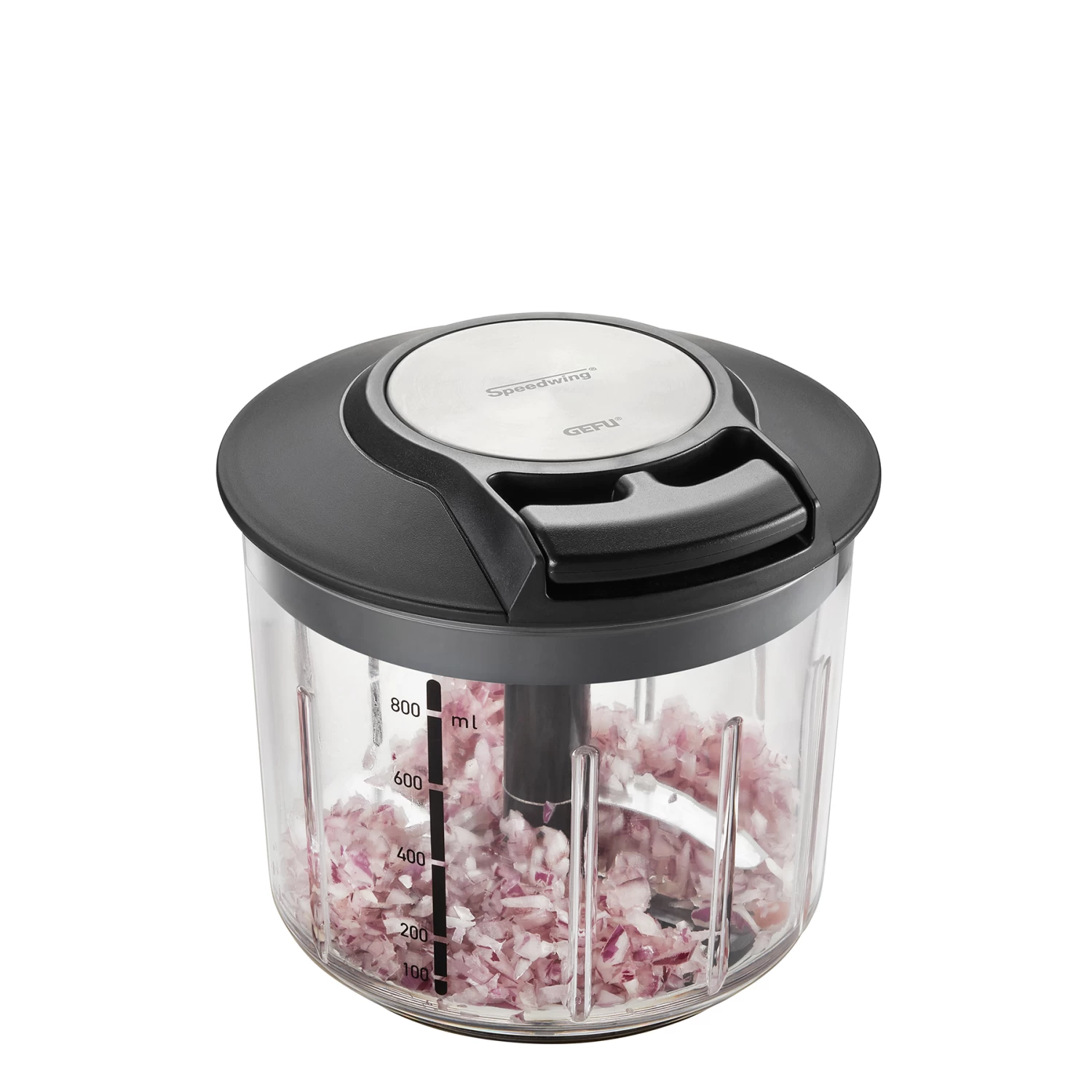 Met de Gefu Hakmolen kunt u eenvoudig groentes mixen, snijden of pureren. Dit doet u door middel van een handig touwmechanisme. De twee zeer scherpe geboge messen zorgen voor een optimaal resultaat. De snijder is gemaakt van kunststof. De twee snij- elementen zijn gemaakt van Japans lemmetstaal en hebben twee gevormde snijvlakken. De capaciteit van de transparante reservoir is 1000 ml. Door de trekmechanisme heeft u geen stroom nodig en kunt u de Gefu multisnijder overal mee naar toe nemen.