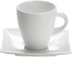 De East Meets West is een productlijn van serviesproducten met vierkantige en rechthoekige ontwerpen met daarin sierlijke rondingen aan de binnenzijde. De theekop met schotel is 13 cm breed en 8.7 cm hoog. Dit unieke servies is van hoogwaardig wit porselein en is gemakkelijk te combineren met de vele andere lijnen van Maxwell & Williams.
