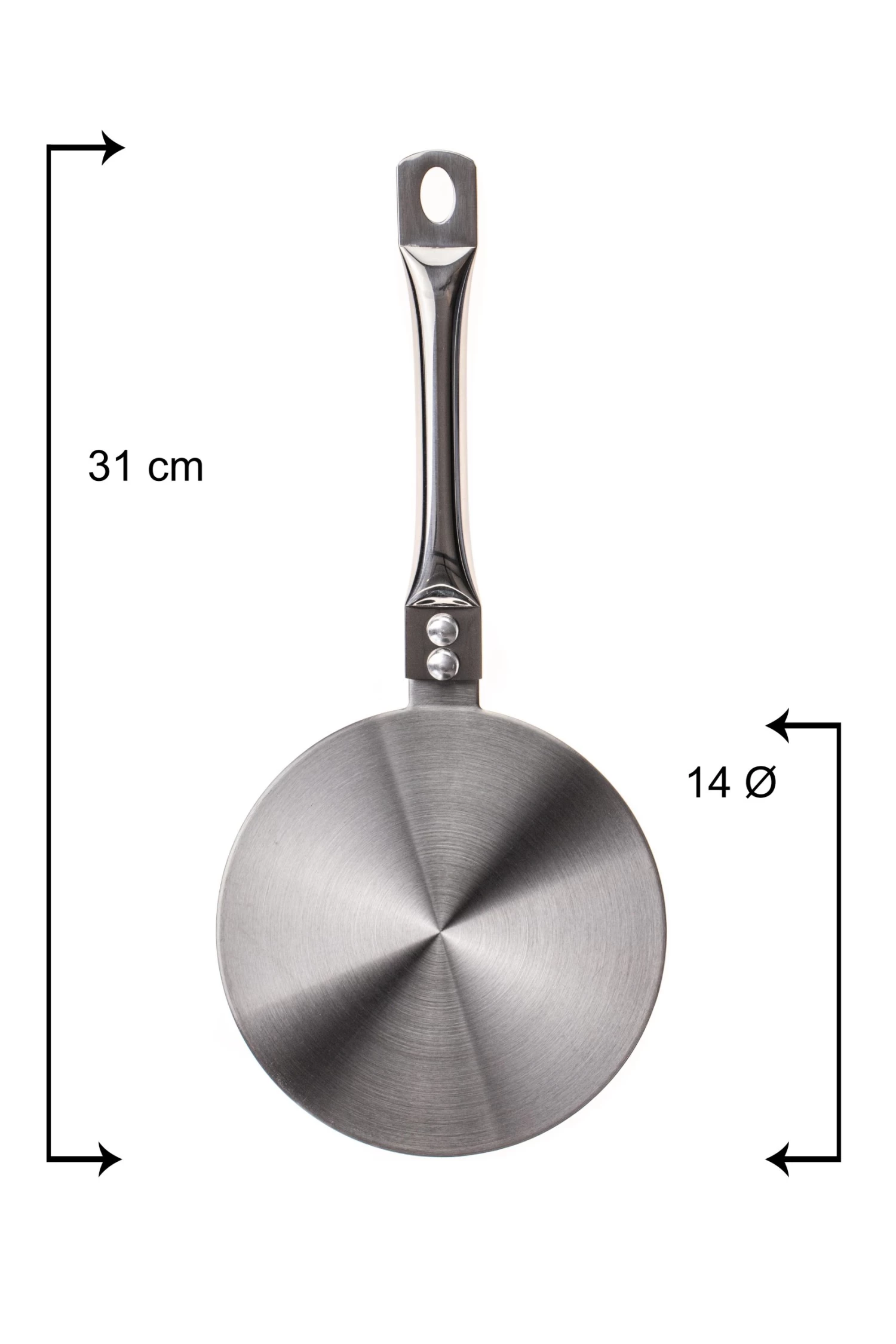 Deze inductie adapter is gemaakt van roestvrij staal en heeft een diameter van 14 centimeter.