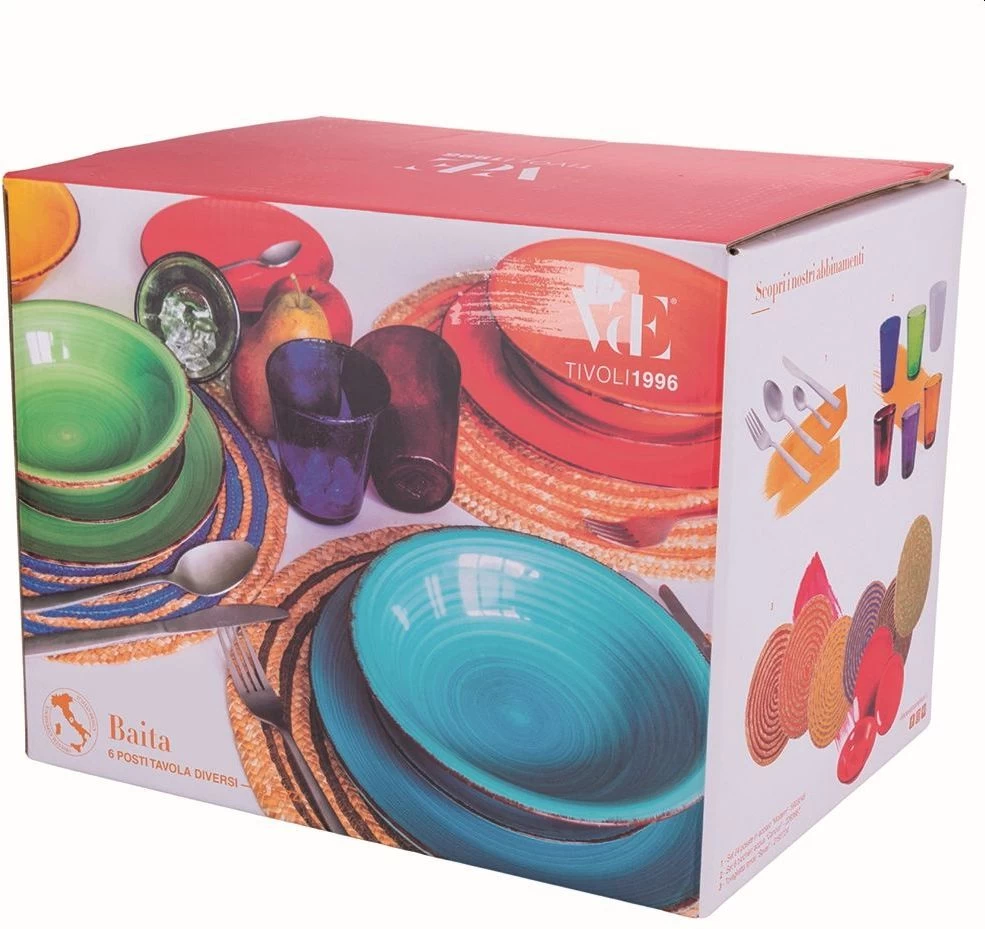 Met de Villa d’Este Serviesset Baita – Colori Caldi – 18-delig / 6 personen wordt het eten een feest! Deze serviesset bestaat namelijk uit Diverse kleuren, waardoor jij een vrolijke tafel dekt! Het servies is gemaakt van Aardewerk en is geschikt voor 6 personen. Daarnaast is het ook nog met de hand geschilderd, waardoor elk stuk uniek is! Na het gebruiken van de Villa d’Este Serviesset Baita – Colori Caldi – 18-delig / 6 personen kunnen deze eenvoudig worden gereinigd in de vaatwasser. De serviesset bestaat uit: