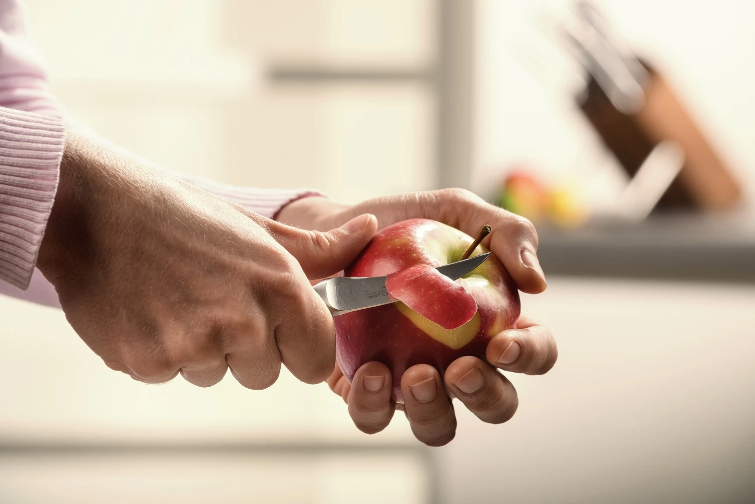Appels uitboren, komkommer in fijne plakjes snijden en paprika blokjes snijden. Deze snij taken gaan zuiver en probleemloos met het groentemes van Wusthof. Het mes met het korte lemmet van 7 cm ligt vast in de hand. Het mes heeft een gladde snijrand en is ideaal voor het decoratief snijden van groente en fruit.